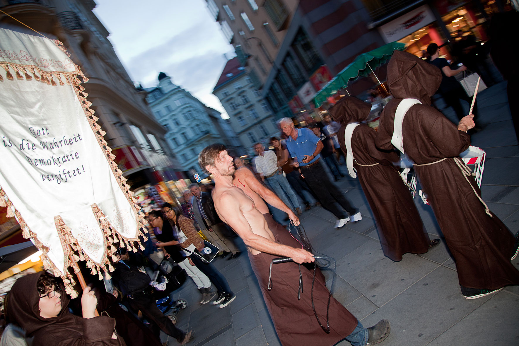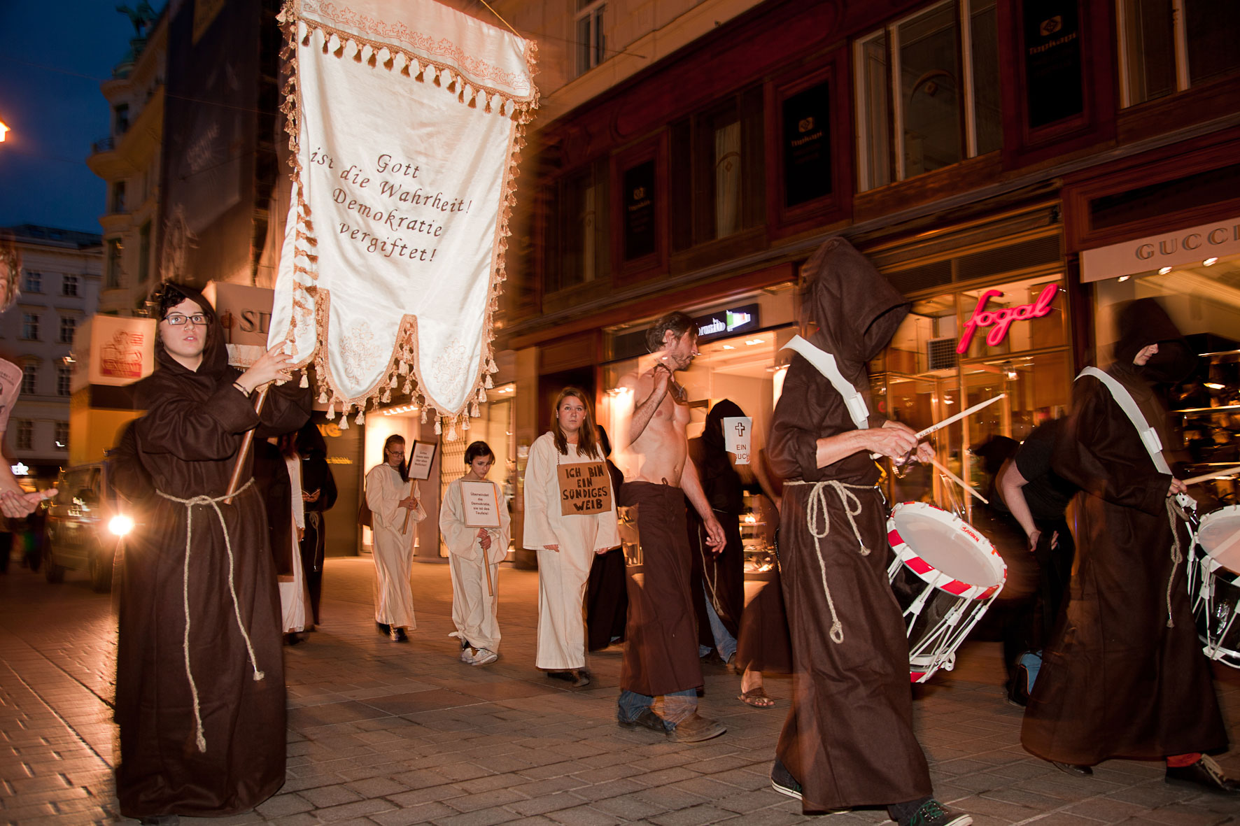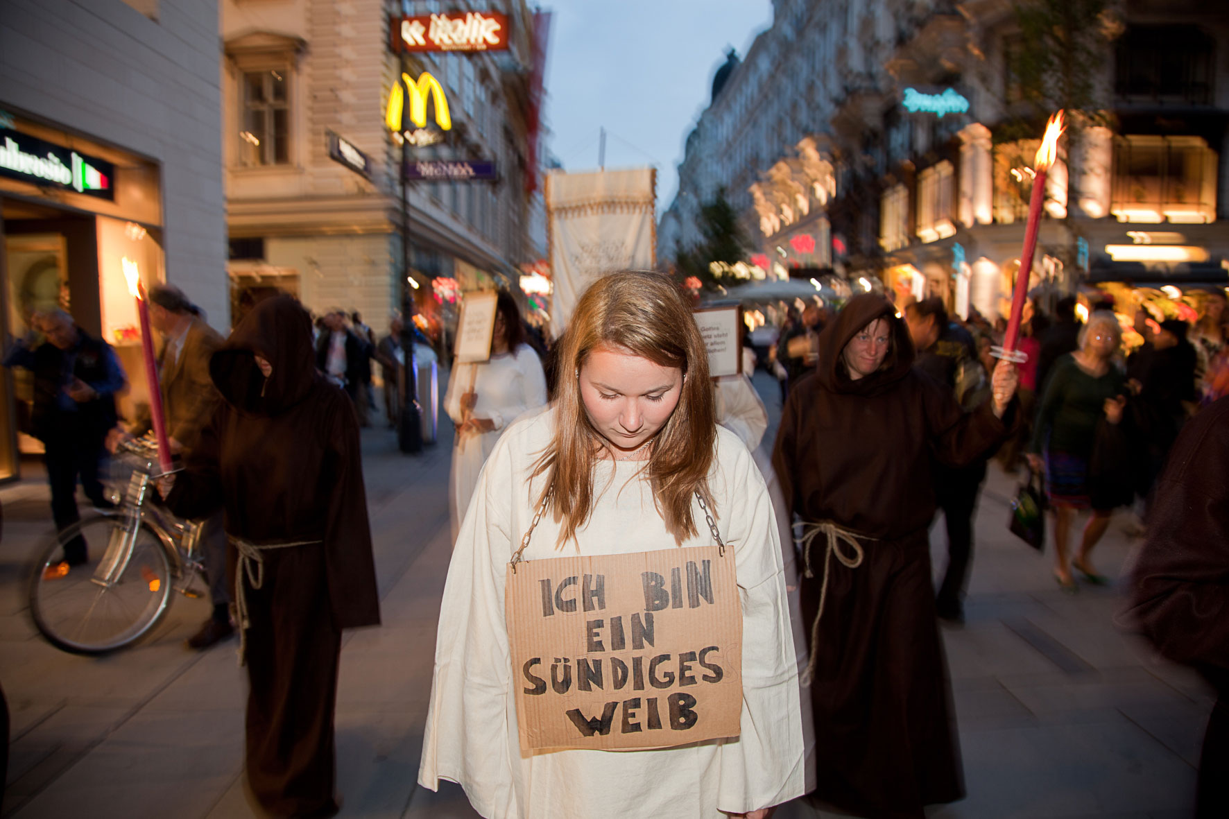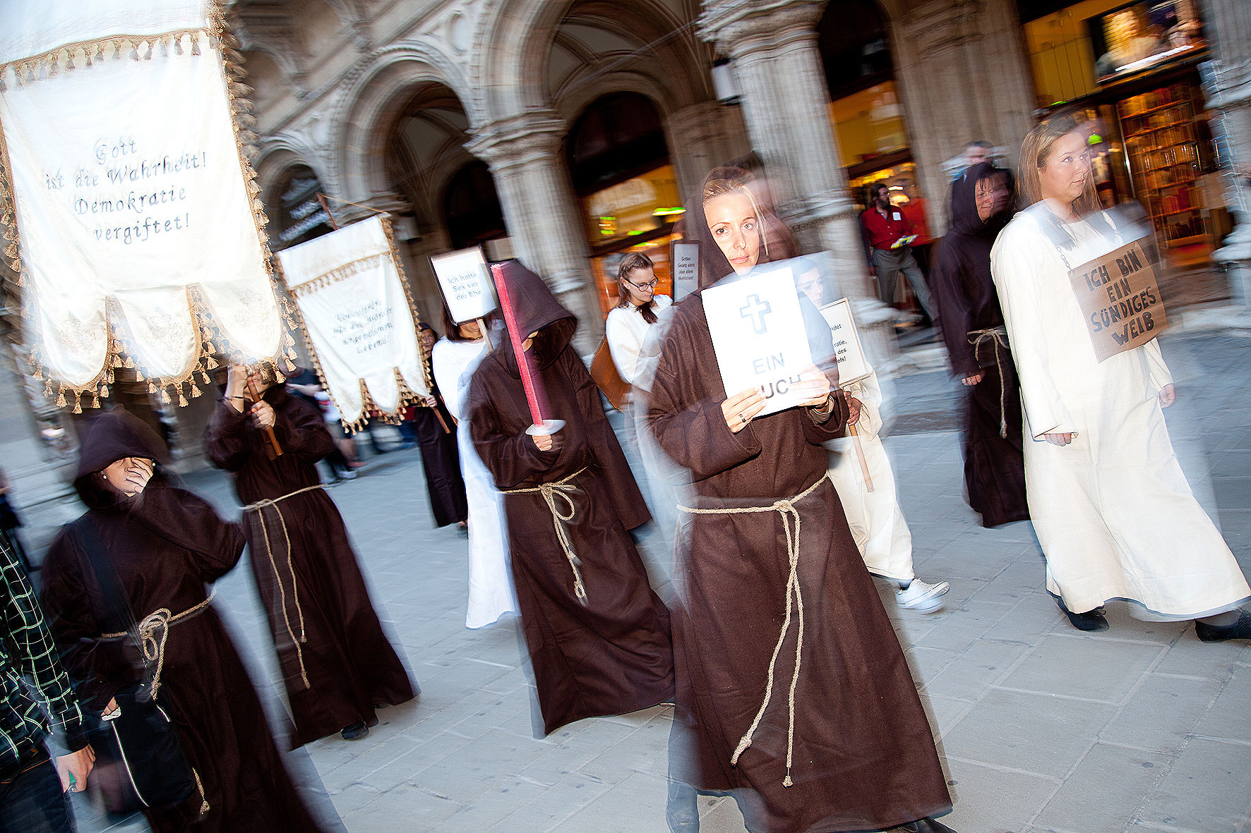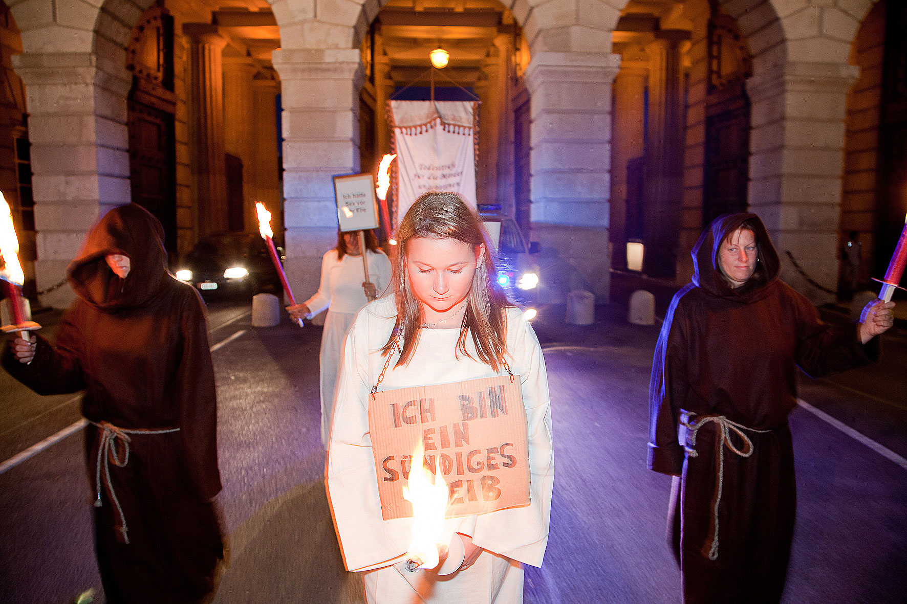 Die absurden Forderungen des „Hohen Rates der Bußbrüder“, die den Fundamentalismus radikaler Abtreibungsgegner auf die Spitze trieben und enttarnten ihn durch Überzeichnung.